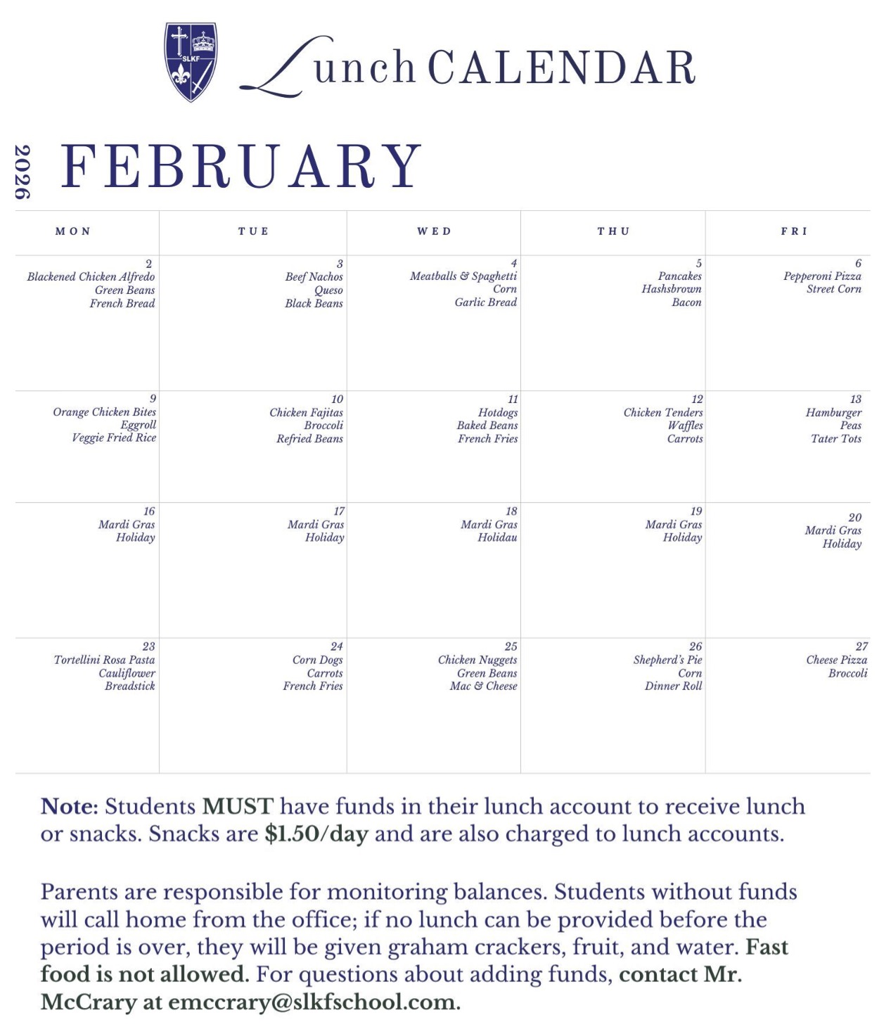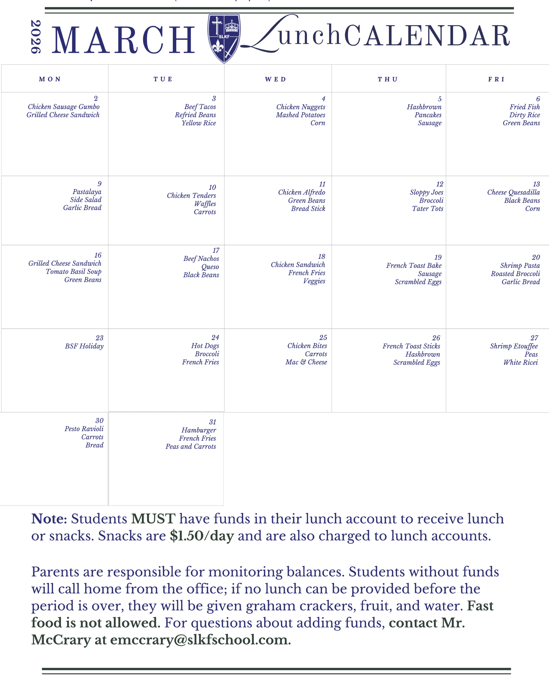 Lunch payments can be made via student FACTS accounts. Parents will receive an email with detailed instructions on how to add money to lunch accounts prior to their student’s start date.